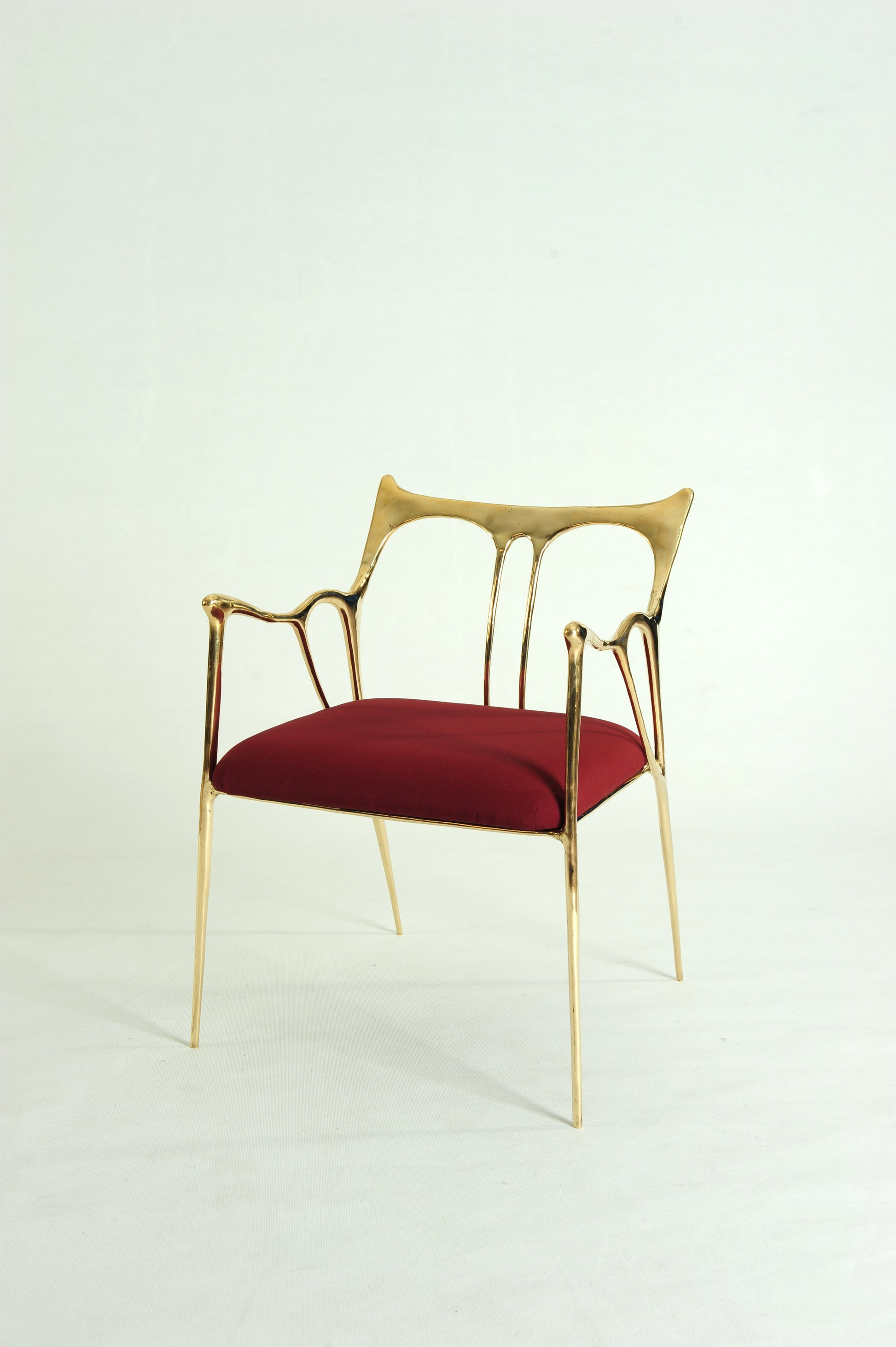 The Sumi Studio Chair is a piece inspired by the fluid elegance of ink calligraphy. This sophisticated chair serves as an accent, dining, or office piece, combining functionality with artistic modern luxury decor and timeless style. Its sleek brass frame adds refined elegance to any indoor or outdoor space.